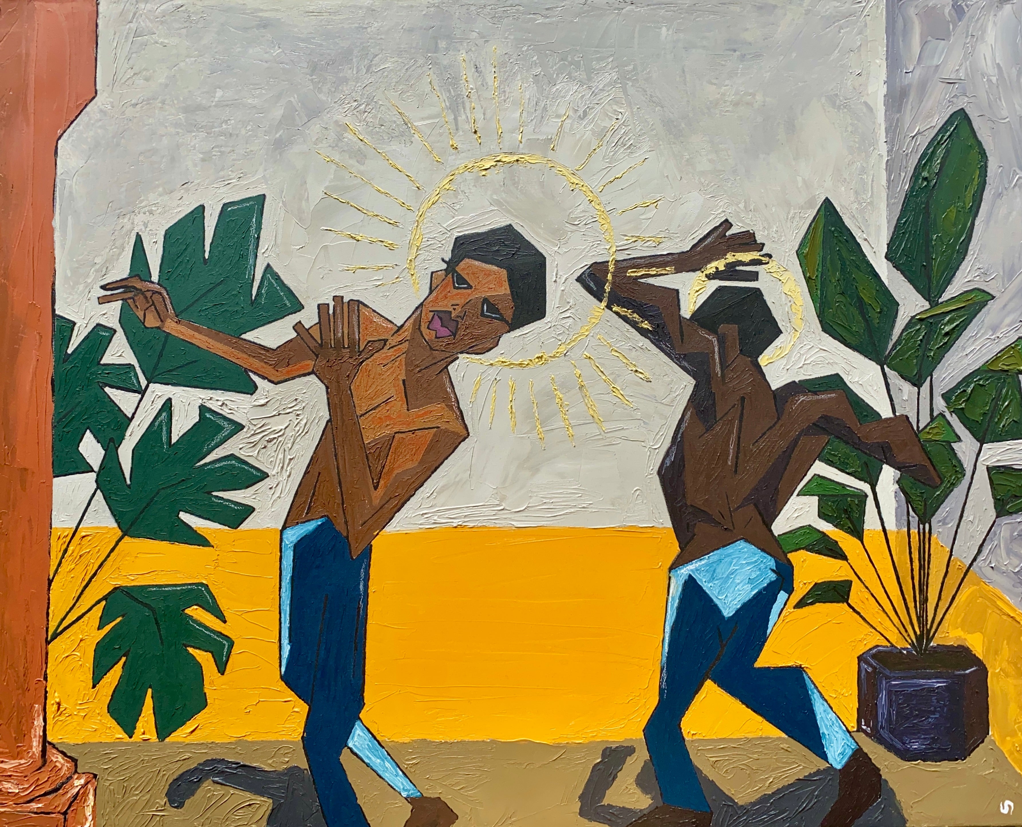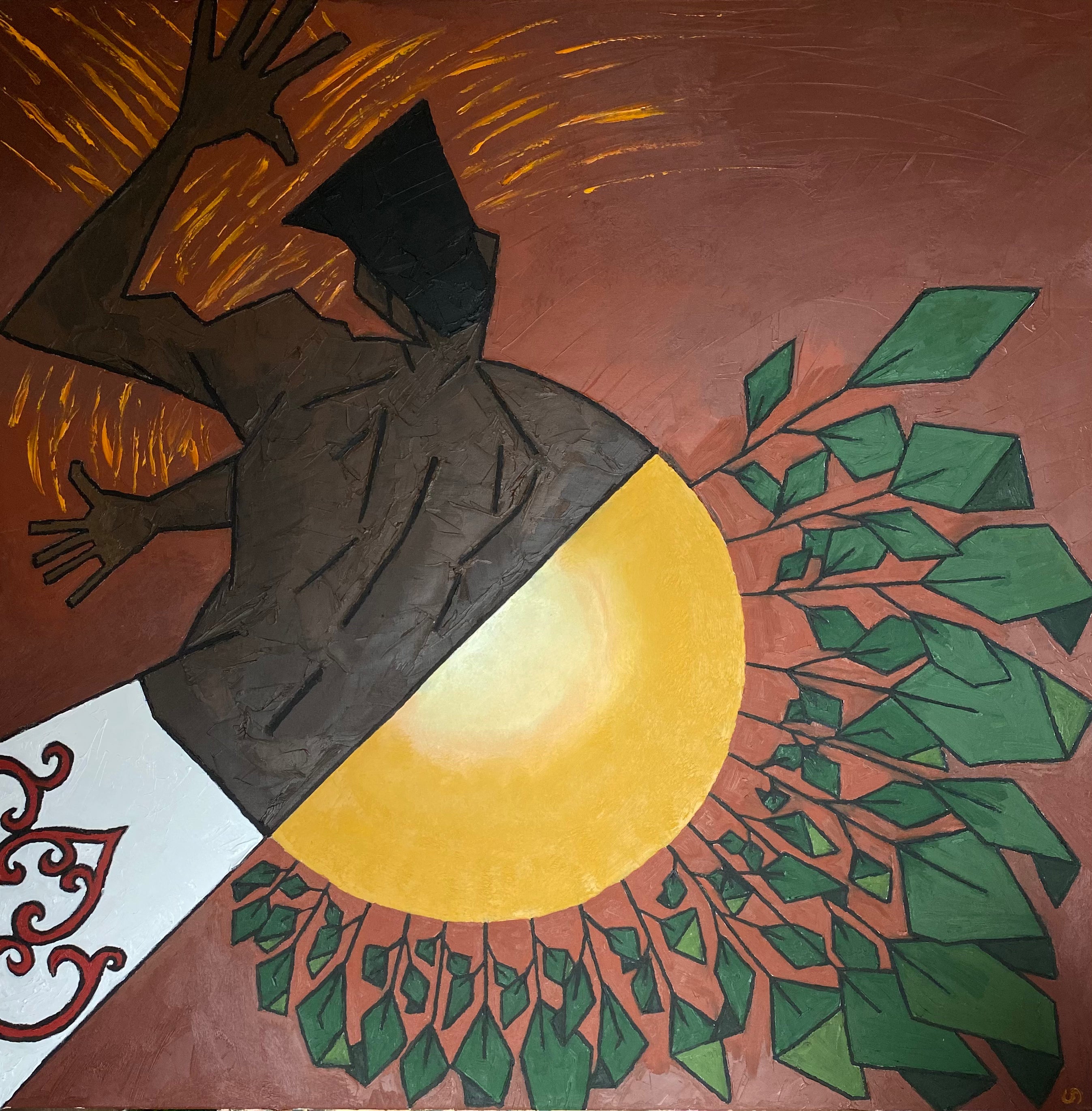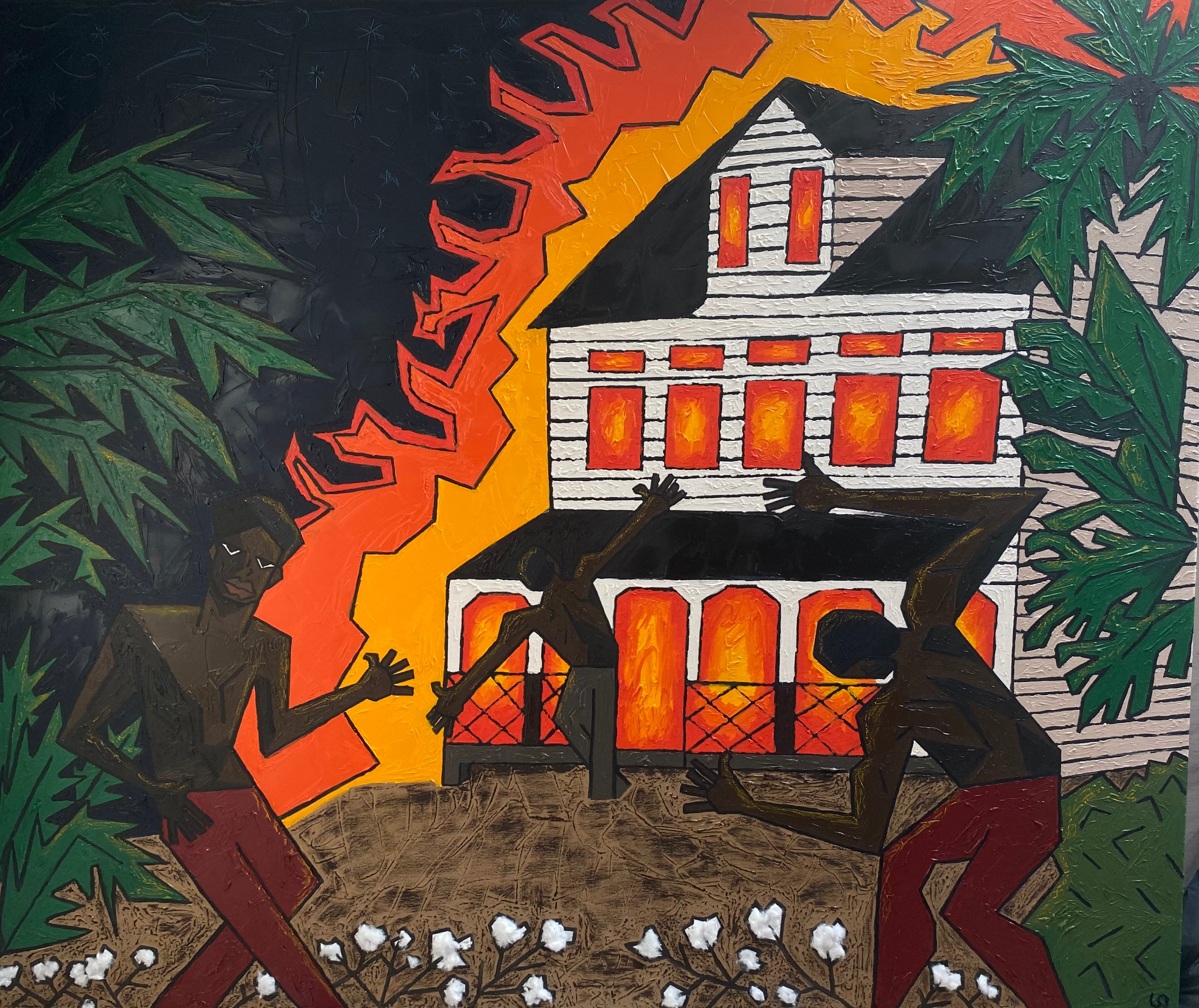 In the painting, the burning house of a slave owner is depicted. A symbol of resistance and the end of oppression.